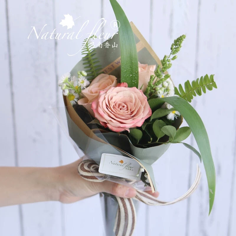 Small in size but big on sentiment, this petite bouquet is perfect for a 'just because' moment. Featuring vintage 'Cappuccino' or dusty pink roses accented with delicate chamomile and fern, it is wrapped in simple, natural kraft and sage paper. Ideal for a first date, a thank-you gesture, or a desktop brightener